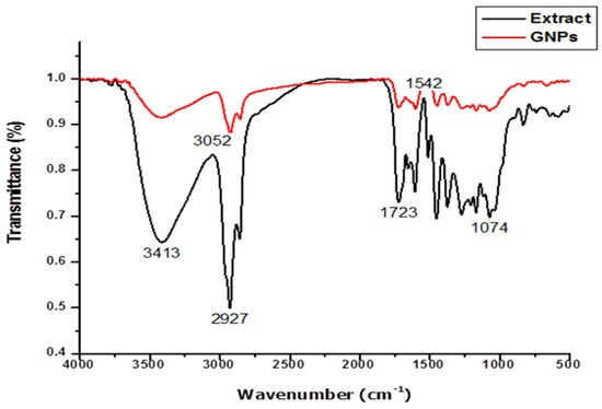 A representative FT-IR spectrum of the synthesized nanoparticles and extract is shown in Figure 5. The leaves extract showed prominent peaks at 1074, 1723, 2927, and 3413 cm−1.