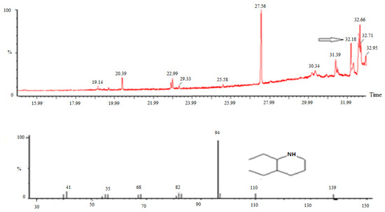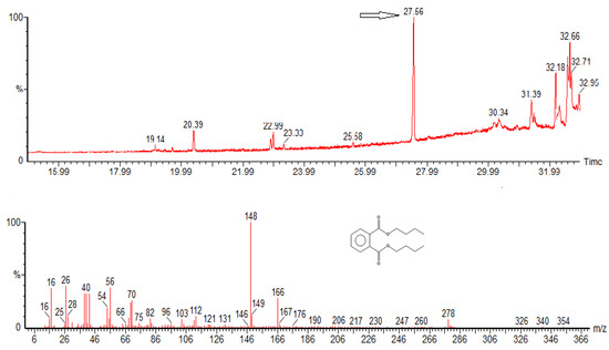 In current study compound 4 showed retention time of 27.56 which is in agreement with literature [42] A broad and prominent peak was observed in the spectrum. The mass spectrum of compound 4 is given below (Figure 8). This was compared with the mass spectrum of dibutyl phthalate, and the maximum peaks of dibutyl phthalate matched with compound 4. Compound 7 was found at 32.18 min retention time (Figure 9), which was also reported for Tecomella undulate [43] with an amount of 17.13%, while in present study, the compound was observed to be 32.18% by area. This compound belonged to an alkaloid class of compounds and also reported for Haliclona tulearensis [44]. Compounds 2 and 3 might be responsible for the reduction and stabilization of nanoparticles. It is supposed that different-shaped polyol and water-soluble heterocyclic plant constituents are mainly responsible for the reduction of gold ions.