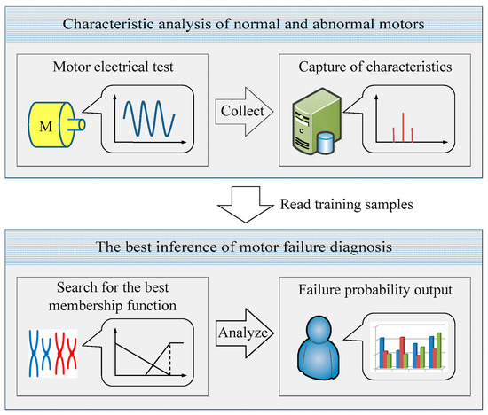 Above all, this paper proposes an effective rotor failure diagnosis method (Figure 1), which contains two core components: (1) use of electrical detection to collect motor current data and capture characteristics of normal and abnormal motors by fast Fourier transform, so as to construct the diagnosis database; and (2) putting the training samples into a genetic algorithm to search for the best membership functions, so as to promote the benefits of failure diagnosis.
