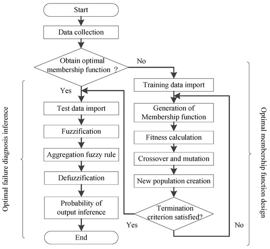 The design of the optimal membership function proposed in this research is implemented through the combination of fuzzy theory and the genetic algorithm. The process is as shown in Figure 4. First, genetic algorithm is used to learn the energy characteristics of the training samples and search the optimal membership function. Then the test samples are used to verify the optimal efficiency. This section will use a TE-204 motor as an example to introduce the design process of the rotor failure diagnosis, and it can be divided into: (1) data collection; (2) generation of membership function; (3) fitness evaluation; (4) crossover and mutation; and (5) termination conditions.