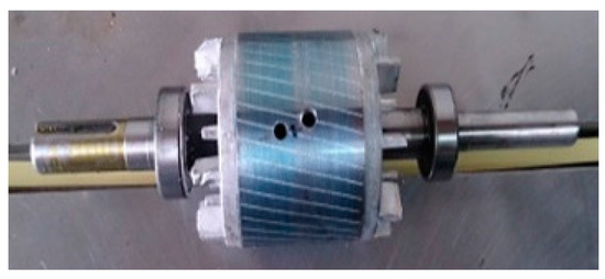 This research uses a TE-204 three-phase squirrel-cage induction motor as the test model. The specification is as shown in Table 1. The diagnosis needs a normal motor and a failure motor for comparison. Thus, two holes were drilled on the rotor for it to have one broken bar, as shown in Figure 11. The drilling diameter is 7 mm and the depth is 30 mm.