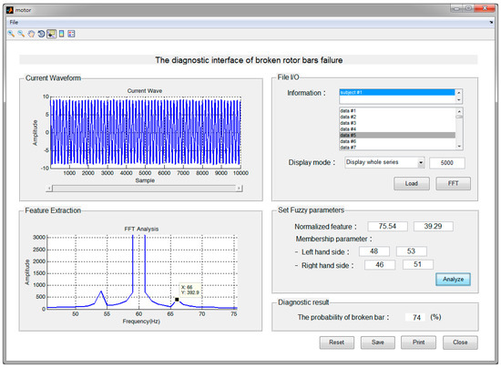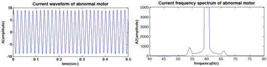 Motor rotor failure can be observed by analyzing the stator current with fast Fourier transform. The purpose of data collection is to record the broken bar’s energy from characteristic frequency (+2s and −2s). The concept is as shown in Figure 5. In this case, training samples and test samples both have 50 records, each of which contain 25 normal and 25 rotor failure samples.
