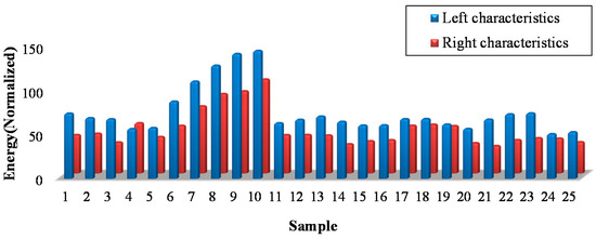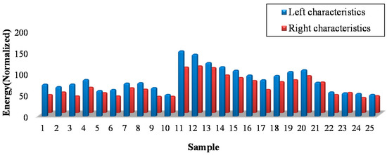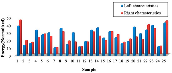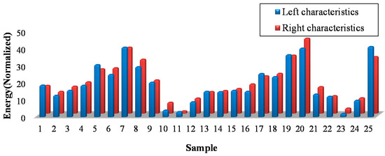 This section uses selected training samples to search for the best membership function with the genetic algorithm. The data distribution of the observed training samples, in Figure 13 and Figure 14, shows that the frequency response of the left and right feature points in a normal motor is much smaller than that of an abnormal motor. Furthermore, the energy of the left-side frequency of an abnormal motor is higher than that of the right side. Above all, the scope of the input membership parameters is already estimated and the results will be the reference for generating genetic individuals.