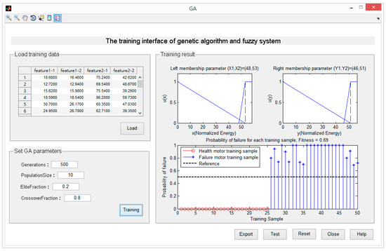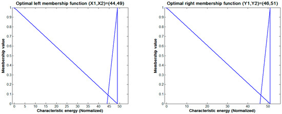 The genetic algorithm proposed in this research is programmed to do 500 optimization searches in training samples. The optimal result of the membership function is shown in Figure 15, where the left and right membership parameters X1, X2, Y1, and Y2 are 44, 49, 46, and 51, respectively. The reason for the left and right membership functions looking so similar is that the overlap between energy ranges of the healthy motor and failure motor in both left and right characteristic frequencies are close in range; the left energy of the healthy motor and failure motor are between the ranges of 100–460 and 440–1300, respectively, and the right energy of the healthy and failure motor are between the ranges of 100–455 and 420–1000, respectively. However, the result of membership function is based on a high diagnostic rate of the training samples, as shown in Figure 16. The results verify that the optimization design for membership function proposed in this paper has fully grasped the electrical differences between normal motor and abnormal motor, so the optimization results are applied to subsequent testing.