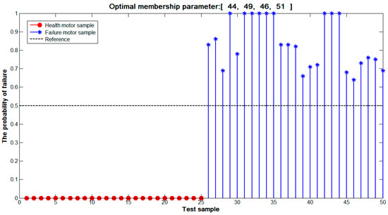 The purpose of this function (1) is to build a diagnosed model by learning the features of the database thoroughly. Therefore, the failure probability of a healthy motor needs to be lower than 50 percent for better motor operation. Conversely, the failure probability of a motor with failure needs to be higher than 50 percent.