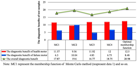 The different membership functions may cause the different benefit of diagnostic results, as is shown in Figure 24. The value represents the fitness of such a method for the fuzzy inference of test samples. It is learned from the comparison, from Figure 24, that the overall detection efficiency of 19.6 in membership function 2 with the Monte Carlo method is closest to 20.98 of the optimized membership function. The reason for choosing this membership function is the stringency of the diagnostic model, resulting in having a normal motor that can easily be inferred as a failure motor, even though this motor is still in the early stage of failure. The above situation can also be interpreted from the perspective of the maintenance cost; the inference result of membership function with the Monte Carlo method will waste more human resources on investigation. However, in the proposed method, the inference results can already accurately grasp the actual state of a motor because the diagnosed results are the best match with the testing samples, which properly determines the chance to repair motor failure.