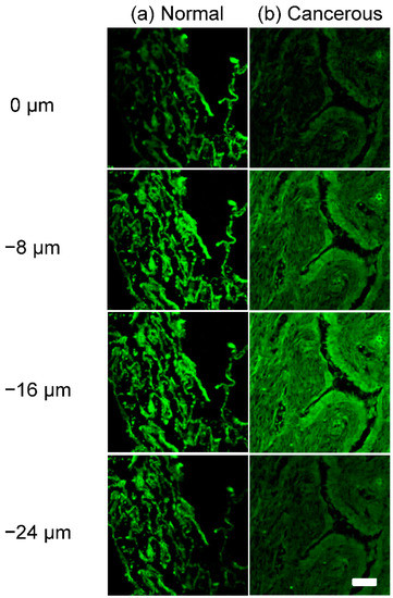 To study the fluorescence imaging capability on thick tissues, the 3D images of two samples were acquired and shown in Figure 2a,b; normal tissue and cancerous tissue. The cellular morphology features were clearly different between normal and cancerous tissue from the surface of the tissue (0 μm) down to the deep position (−24 μm).