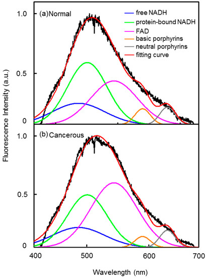 In recent years, autofluorescence of cancer was investigated based on the knowledge that some endogenous fluorophores in the tissues change when normal tissue turns malignant [10,11,12]. Autofluorescence imaging and spectroscopy is a non-invasive, label-free, real-time technique for cancer detection. Autofluorescence emitting from tissues has many intrinsic fluorophores, such as reduced nicotinamide adenine dinucleotide (NADH), flavin adenine dinucleotide (FAD), and porphyrins [13,14]. NADH and FAD are metabolic coenzymes in oxidative phosphorylation, and NADH has a free or protein-bound state [15,16]. Porphyrins are organic compounds and are often used as a tumor-specific marker [17]. Tumor cells exhibit a different metabolic state or microenvironment from normal cells, which associates with changes of these intrinsic fluorophores fluorescence intensity. Thus the difference between normal and cancerous tissues can be investigated based on their autofluorescence spectra. However, this approach is limited by that autofluorescence spectrum features exhibit less specific differences and the origin of the contrasts mechanisms are not clearly identified [18,19].