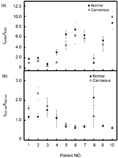 Masilamani et al. found that the ratio of I630 nm/I585 nm in blood or urine samples was about one for normal controls and 2–3 for advanced cervical cancer patients [51]. Similar findings were also reported in blood samples of gastric cancer and breast cancer patients [40]. However, for lung tissue samples in our study, the porphyrins were present in fairly low amounts (Figure 3). It should be noted that I630 nm/I590 nm between normal and cancerous tissue samples showed considerable overlap among the patients as shown in Figure 4. Similar results can also be found for INADH/IFAD values. This inter-patient variation was disadvantageous to analyze the averaged spectra data of patients. Therefore, the signature of spectra for lung tissues may be applicable for the assessment of per individual patient, instead of comparing one patient data with average values.