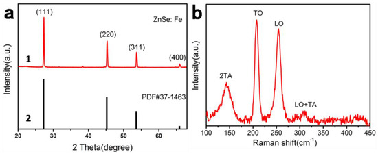 (a) X-ray diffractometer (XRD) pattern of as-prepared Fe doped ZnSe nanoribbons. The corresponding Miller indexes are labeled at the top of the diffraction peaks. The red line 1 is the experimental results of the Fe doped ZnSe nanoribbon, and the black line 2 is the Joint Committee on Powder Diffraction Standards (JCPDS) card of No. 37-1463 of pure ZnSe material; and (b) the micro-Raman spectrum of an individual Fe doped ZnSe nanoribbon with a continuous wave (CW) 532 nm laser as the excited source at room temperature.