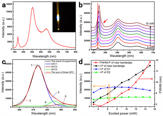 In order to study the elementary excitations of Fe doped ZnSe nanoribbon, excited power-dependent PL spectra for one nanoribbon have been measured. Figure 3a shows its PL spectrum and optical morphology image of the nanoribbon in a dark field by 405 nm laser exciting. When a laser excites the nanoribbon, their endpoints emit yellow light, demonstrating that it has excellent optical waveguide properties, as shown in the inset of Figure 3a. In its PL spectrum, there are three emission peaks at 467, 553 and 630 nm, respectively. The first emission peak at 467 nm is assigned to near band-edge exciton emissions, whose nature needs further identification for the bandgap of pure ZnSe material is at about 2.7 eV (460 nm) at room temperature [27]. The second (D1) and third (D2) emission peak at 553 and 630 nm are related to Fe3+ d-d transition, which will be discussed later. Figure 3b shows power-dependent PL spectra from 3 to 15 mW, in which the emission peak of near band edge shifts to long wavelengths with excited power increasing. To study the origin and the redshift of near band-edge emission, the emission fitting curves have been obtained, as shown in Figure 3c. The black curve is the experimental line measured at P = 15 mW, which can be fitted by three Gaussian functions, denoted as GFC1 (473 nm), GFC2 (485 nm), and GFC3 (492 nm), respectively. The peak GFC1 originates from the bound exciton (BX) instead of the free exciton (FX) because it has lower energy than free excitons, and it can be confirmed later. The peak GFC3 should be attributed to the electron hole plasma (EHP) recombination emission, which has large full widths at half maximum (FWHM) and lower energy emission. At high power, higher carrier density is generated, which enhances carrier exchange interaction and leads to the band-gap renormalization of the nanoribbon [28], that is, it forms EHP recombination emission at high excited power and results in a red-shift of the emission peak [29]. This phenomenon is related to the photoheating by a CW laser. The GFC2 should be assigned to the emission of exciton magnetic polaron (EMP) due to the existence of ferromagnetic coupled Fe(III) cluster. At low excited power, the EMP emission in alio-valence ion doping ZnSe is not present, as shown in Figure 3b. The main elementary excitation of the near band-edge emission is bound excitons, and the EMP emission might be minor and merge with BX, so that EMP cannot be distinguished clearly. EMP can be enhanced at high excitation power due to larger binding energy, so a shoulder shows up at the long wavelength side of the near band-edge emission band (BX) at increasing powers. With further increasing power, a part of BX may dissociate into electron and hole to lead e-h plasma emission at around 493 nm due to excess charge effect of Fe3+, while EMP emission become significant in nanoribbons, as marked by the red arrow in Figure 3b. In addition, the energy span of GFC1 and GFC2 is 64 meV, which is larger than the energy of LO phonons, which eliminates the possibility of LO phonon replicas [3]. Previous works studied the formation and emission of EMP in transition metal ion doped II–VI semiconductor belts, which demonstrates EMP emission at the long wavelength side of FX. For example, Zou et al. researched the EMP behavior in Co doped CdS nanowires [30] and Liu et al. reported Mn doped ZnSe nanowires [31]. Thus, the GFC2 could be assigned to the EMP emission. With increasing powers, the FWHM of near band-edge emission band BX increases super-linearly, as shown with the red curve of Figure 3d, which is often related to the giant spin splitting of exciton states in TM doped semiconductors [32]. Moreover, their intensity increases linearly, as shown with the black line in Figure 3d, which confirms that it is TM ion dopant related BX and not only EMP that dominate the luminescence. The previous exciton state is related to the spin of a single TM ion dopant to couple with FX in the TM doped semiconductor, while EMP was the FX coupling with a multi-spin ferromagnetic coupled cluster in DMS. In both systems, the phonon scatterings are very involved in their relaxations. Then, some EHP recombination emissions become significant at high excitation power [33]. Due to the narrow measuring range, the intensity of the BX emission has not yet reached saturation, which also indicates a dominant component of BX in the near band-edge emission but not carriers.