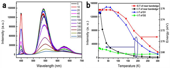 It is easy to think that the emission peaks of D1 and D2 are related to structural defects of ZnSe nanoribbons. Many works reported the defect-related emissions between 500 and 700 nm, such as point defect Zn vacancies, Zn interstitials, and structure defects dislocations, stacking faults and so on [35,36,37]. In the PL spectrum of Fe3+ doped ZnSe nanoribbon, the narrow FWHM of D1 and D2 and the sharp near band-edge emission have eliminated the possibility of point defects for the latter often strongly relax the FX emission. The emission of structural defects is dependent on the change of temperatures. With this idea, temperature-dependent PL spectra are shown in Figure 4a. Figure 3d reveals that the intensities of the three emission peaks increase by increasing powers and the intensity of near band-edge emission increases faster than the emissions of D1 and D2 at the same time, indicating a clear character of a low defect lattice.