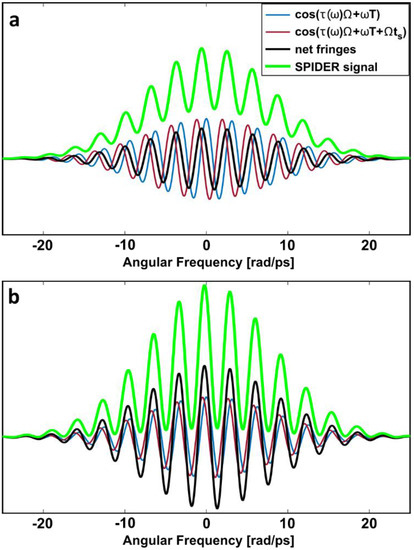 where is the difference in shear experienced by the two pulses in the double pulse. Compared to Equation (3), both the second pulse and its sheared replica experience an additional shear of . This is not likely to have a large impact on the measurement, and this effect is not taken into account by the typical SPIDER retrieval procedure.