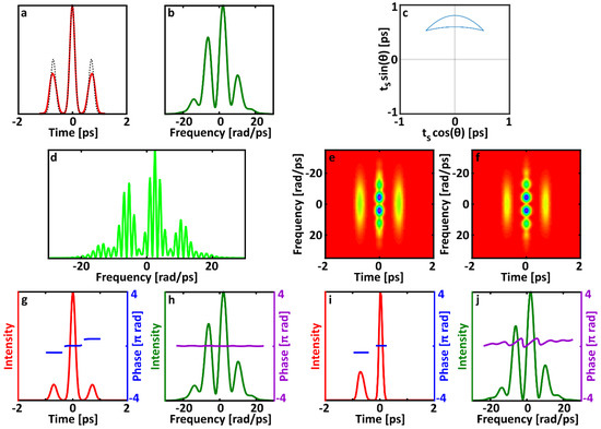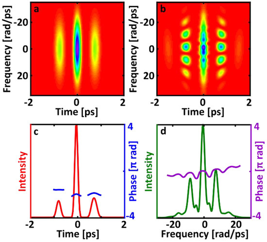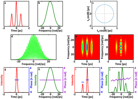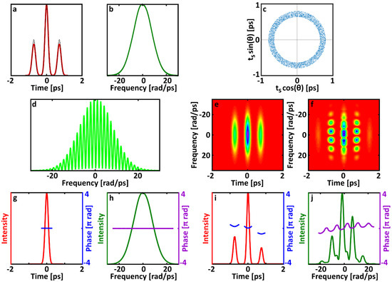 Our simulations average over sets of 5000 pulses. We calculate the appropriate measured trace for each pulse using Equation (6) for SPIDER and Equation (8) for SHG FROG. To create the double pulses, we use flat-phase Gaussian pulses with a temporal full width at half maximum (FWHM) of 150 fs. The temporal grid comprises 4096 points with a spacing of 20 fs. The simulation’s resulting spectral resolution is 0.077 rad/ps. For the SPIDER measurement, the spectral shear was chosen to be 12 frequency steps (0.9 rad/ps) and the delay was chosen to be 4 ps. The temporal support is 6.8 ps for a spectral shear of 0.9 rad/ps. The average separation of the double pulses in the pulse trains varies somewhat between the different cases considered, but is approximately 700 fs overall. Because the average pulse separation (0.7 ps) was much smaller than the temporal range (6.8 ps), our calculations suggest that there should be little fringe cancellation and good fringe visibility in the simulated SPIDER measurements.