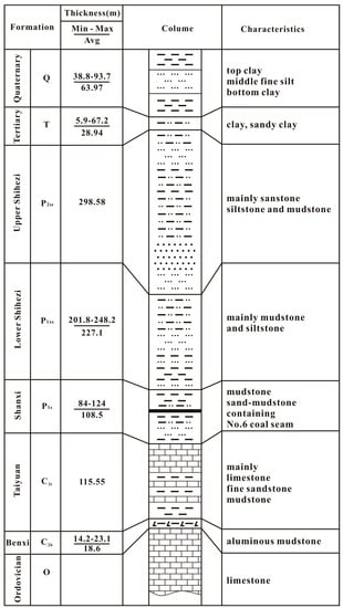 The strata, from the earliest to most recent order, are Ordovician (O), Carboniferous (C), Permian (P), Tertiary (T), and Quaternary (Q) (see the generalized stratigraphy in Figure 1). The structure of the study area—which is monoclinal, inclining from north-northeast (NNE) to northwest (NW)—is complex because it is located in the west limb of the Tulou anticline belonging to a secondary fold of the south endpoint of Dawuji synclinorium. The secondary folds are well developed, enabling partly stratum sloping towards north-east (NE) or north-west (NW).