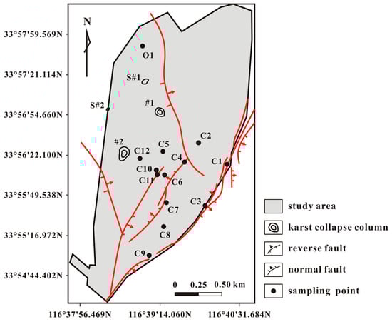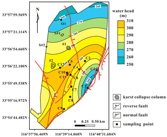Twelve groundwater samples (including C1, C2, C3, C4, C5, C6, C7, C8, C9, C10, C11, C12 in Figure 2) from Carboniferous Taiyuan limestone karst-fissure aquifer boreholes and one groundwater sample (O1) from Ordovician limestone karst-fissure aquifer were collected and detected to analyze the hydrogeochemical feature of groundwater in the study area. As the location of borehole C1 keeps away from the collapse columns by an impermeable reverse fault at the boundary of the study area, the hydrogeochemical data of Sample C1 groundwater can be set as the initial groundwater hydrogeochemical feature in Carboniferous Taiyuan limestone karst-fissure aquifer systems. As the water level in Ordovician limestone karst-fissure aquifer is higher than that in Taiyuan limestone karst-fissure aquifer, Sample O1 can represent original groundwater hydrogeochemical feature in Ordovician limestone karst-fissure aquifer systems. The specific distributions of sampling points are shown in Figure 3.