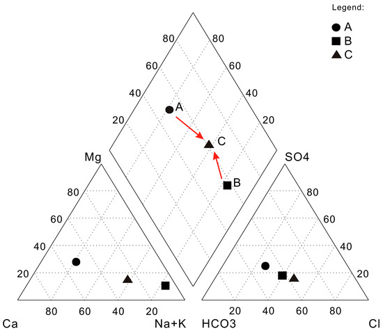 Piper diagram is used to identify the chemical type of all the groundwater samples and to calculate the groundwater mixing ratios in different boreholes [30]. The principle of this graphical method is to classify groundwater chemical types by plotting the milligram equivalent percentage (mEq%) of all the conventional groundwater chemical ions [31,32,33], including calcium (Ca2+), magnesium (Mg2+), sodium (Na+), potassium (K+), bicarbonate (HCO3−), sulphate (SO42−), and chloride (Cl−), in two triangle fields (the anions and the cations), and then projecting the two ternary plots onto a diamond [34]. The diamond is a matrix transformation of a graph of the anions ((sulfate + chloride)/total anions) and cations ((sodium + potassium)/total cations) [35].