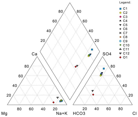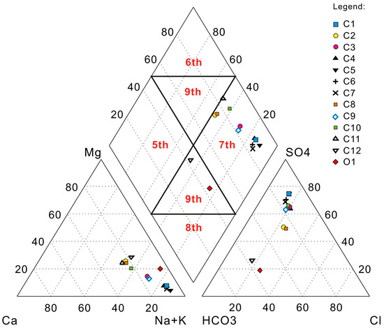 According to the concentrations of cations and anions, the piper diagram of all groundwater samples was plotted in Figure 5 and the hydrochemical types [36,37] of all groundwater samples were analyzed in Table 3. In the piper diagram, most groundwater samples (except of C12 and O1) were located in the seventh district of the diamond field, and the hydrochemical type of groundwater [38,39] is SO4-K + Na. This kind of groundwater is typically connate water which is highly mineralized, the primarily conventional groundwater chemical ions [40] are SO42− and K+ + Na+ with a content percentage of greater than 50%, and the TDS value is usually high. Groundwater samples of C12 and O1 were located in the ninth district of the diamond field, and the hydrochemical type of groundwater is HCO3-K + Na. This kind of groundwater is typically geothermal water in the deep stratum, and there were no primary cations and anions with a percentage content greater than 50%.