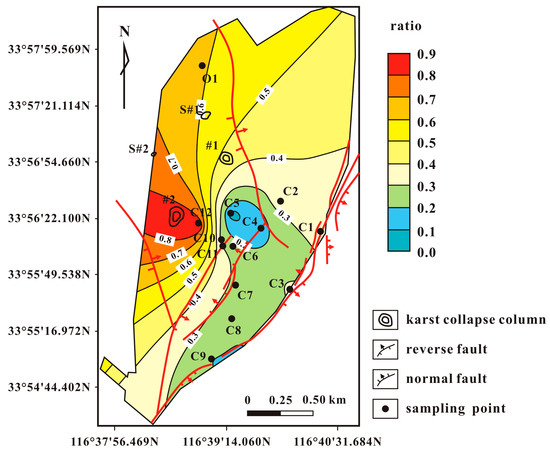 A mixing ratio contour map is produced in Figure 8. The groundwater mixing ratio in Figure 8 generally showed that near the #2 karst collapse column, the mixing ratio of groundwater deriving from Ordovician aquifer to groundwater deriving from Carboniferous Taiyuan aquifer was large, and far away from the collapse column the mixing ratio was small. A singular point of smallest ratio may exist because the mixing ratio was also affected by the groundwater direction. As shown in Figure 2, the groundwater in the Carboniferous Taiyuan limestone karst-fissure aquifer flows in three directions, dividing the field groundwater flows into opposite directions. Hence, the mixing ratio in the stagnating flow area is the smallest. In general, the mixing ratio is mainly affected by the distance of the sampling location to the #2 karst collapse column.
