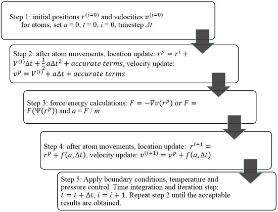 Molecular Dynamics (MD), originating in theoretical physics, was applied widely in materials science [13,14]. MD is a kind of computer program to simulate the movements of atoms in materials, and the atoms and molecules interact for a designated time based on the Newton’s law of motion. The trajectories of atoms and molecules are monitored, and the energy of the system is computed. In physics, MD was used to examine physical properties [13,14]. The evolution of dynamics in a single molecule is used to determine the macro properties of the system. The “statistical mechanics by number” and “Laplace’s vision of Newtonian mechanics” were also used to describe the molecular dynamics. The simulation size and total duration were selected so that the calculation can be finished within a reasonable amount of time [15]. The Large-scale Atomic/Molecular Massively Parallel Simulator (LAMMPS) [16] and the Monte Carlo for Complex Chemical Systems (MCCCS) program [17] were commonly used for MD simulations. The computation algorithm of the MD simulation is shown in Figure 1. In addition, compared to other methods (such as Finite Element Method (FEM) and Discrete Element Method (DEM)), the MD method helps address specific problems or principles of atoms or materials, and also, a specific property can be studied by altering specific contributions. Moreover, the material behaviors or response can be analyzed under extreme conditions on a nanoscale.