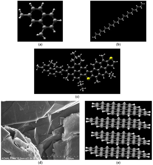 SEM image of multi-layer xGNP particles, structure of multi-layer xGNP model, components of control asphalt model and xGNP modified asphalt model. (a) The structure of 1,7-Dimethaylnaphtalene; (b) the structure of docosane: white color for hydrogen atom; grey color for carbon atom; (c) The structure of asphaltene: white color for hydrogen atom; grey color for carbon atom and yellow color for sulfur atom; (d) FE-SEM image of multi-layer xGNP nanoplatelets; (e) Multi-layer graphite model: white color for hydrogen atom; grey color for carbon atom; (f) Molecular structures of xGNP modified asphalt model: white color for hydrogen atom; grey color for carbon atom and yellow color for sulfur atom.