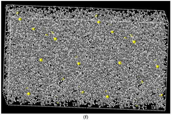 Based on previous work of the authors [24] and reference [18], three components were used in the control asphalt including the asphaltenes, aromatics, and saturates at a ratio of 5:27:41. The ratio of asphaltenes, aromatics and saturates was cited form the reference [18], and this ratio (asphaltenes, aromatics and saturates at 5:27:41) in the asphalt model was based on the asphaltene mass fraction (20.7 wt%) and alkane/aromatic carbon ratio (59.6 wt%, 19.7 wt%; wt% is weight percentage) [35]. The 1,7-Dimethylnaphthalene [36] (Figure 2a) and docosane [37] (Figure 2b) were used to represent the aromatics and saturates, respectively. 1,7-Dimethylnaphthalene (C12H12) was reported by Zhang [18] and Groenzin [36] based on the ratio of alkane and aromatic in the asphalt. The docosane (C22H46) was reported by Zhang [18] and Kowalwski [37] based on the properties (melting and boiling points) of docosane and saturates. The asphaltene structure (Figure 2c) is from the references [18,38], C64H52S2. In addition, the ESP was calculated and assigned to the components by NWChem. The control asphalt model was built through the compression of three components with NPT ensemble, and running time is around 1 ns. The start density of the control asphalt system is around 0.1 g/cm3, and the target density is 1.0 g/cm3, which is similar to that of the real asphalt. The low start density is good for relocations of atoms or components of systems during the energy optimization. Based on the previous property calculation of the asphalt model with the same components [18,24], the properties of the asphalt model are similar to those of the real asphalt tested in the laboratory. In this study, the ACEFF and ESP were assigned in the MD systems, and it is expected that the improvement of properties will be observed during the calculations. Therefore, the control asphalt model with ACEFF was generated to represent the control asphalt PG 58-28.