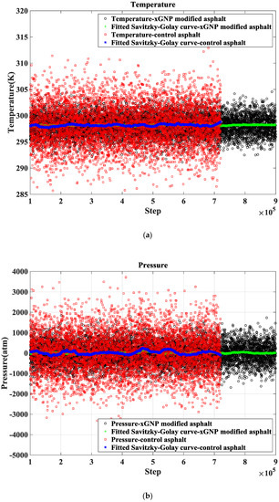 Figure 3a,b show the temperatures and pressures in the control and modified asphalt systems under the NPT ensemble. The systems were run more than 1 ns to be stable and optimized. Some of the results with the simulation steps are shown in Figure 3. The data were fitted by a Savitzky-Golay filter [39] (a kind of generalized moving average) with a span (a parameter to control the average) of 10%. The temperatures of the control and xGNP modified asphalt are close to 298 K during these steps, and the pressures fluctuate around 1 atmosphere (atm). Meanwhile, it is interesting to note that the data fluctuation of the control model is obviously greater than that of the modified asphalt model due to the difference in the molecular number. The fluctuated data range varies with a variation based on the baseline of the moving average, where N is the number of molecules in the MD system [40]. Figure 3c shows densities of the control and xGNP modified asphalt systems, and the data was fitted by a Savitzky-Golay filter [39] with a span of 10%. The densities of the xGNP modified asphalt system are larger than those of the control asphalt model. It is reasonable that the addition of xGNP particles in the control system increases the density of the modified system. It is apparent that the density data amplitude of the control system is larger than that of the xGNP modified asphalt model, as well as the stability, due to their being more molecules. In addition, the densities of the control and xGNP modified asphalt systems are also close to the laboratory (0.95 g/cm3–1.05 g/cm3) [18,40,41] and reference data [18]. Therefore, the modified asphalt model can be deemed reasonable by obtaining a comparable mass density. Figure 3d displays the density curve of the control and xGNP modified asphalt with different temperatures, which range from 233.15 K to 443.15 K. The densities of the asphalt models decrease with the increase in temperature, and the density of xGNP modified system is slightly greater than that of the control model under different temperatures. Meanwhile, the density trends of the control and xGNP modified models are similar to that of the reference model [18]. In addition, the data fluctuation amplitude of xGNP modified model is smaller than that of the control system.