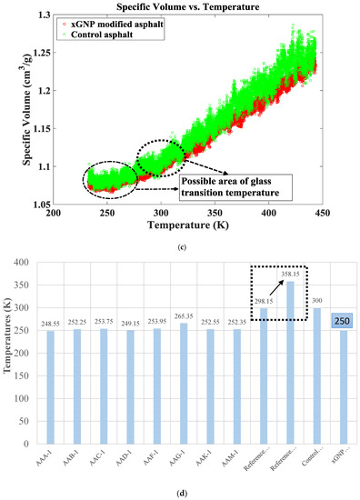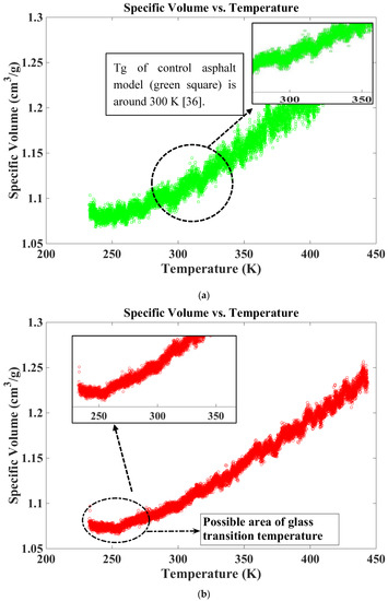 Figure 4a or Figure 4b shows the specific volumes of the control system or xGNP modified asphalt model, respectively. Figure 4c shows the specific volumes of both control and xGNP modified asphalt models. The specific volumes increase with the increasing temperatures of the models. The glass transition temperature of the control asphalt model is around 300 K [24]. As shown in the Figure, it is deduced that the Tg of the xGNP modified asphalt system is around 250 K. Based on the laboratory data in the reference [43], the Tg of asphalt ranges from 223 K to 303 K. The Tg of the modified asphalt model is within the laboratory data range, and it is also better than the reference data [18] (298 K–358 K) of the asphalt model. In order to get better thermal relaxation in the asphalt, a low Tg of asphalt is expected. Figure 4d shows the comparisons of glass transition temperatures of the references and MD simulations. The glass transition temperatures of the Strategic Highway Research Program (SHRP) asphalt binders are all around 250 K [42], including SHRP asphalt AAA-1, AAB-1, AAC-1, AAD-1, AAF-1, AAG-1, AAK-1 and AAM-1. The Tg of xGNP modified asphalt model is close to the glass transition temperatures of SHRP asphalt binders. Therefore, the Tg of xGNP modified asphalt is reasonable and better than the results of the control [24] and reference asphalt models [18].