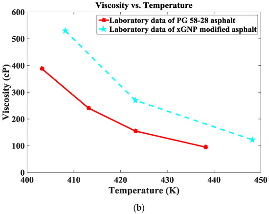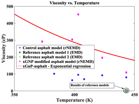 Based on the data analysis from the MD simulation and laboratory data, the viscosity data between the control and xGNP modified asphalt binder models was compared and analyzed, as well as the experimental results. The exponential regressions were used to fit the viscosity data of the control and xGNP modified asphalt binder models. The comparisons between the control and xGNP modified asphalt binder models were conducted, as shown in Figure 8, including the reference data.