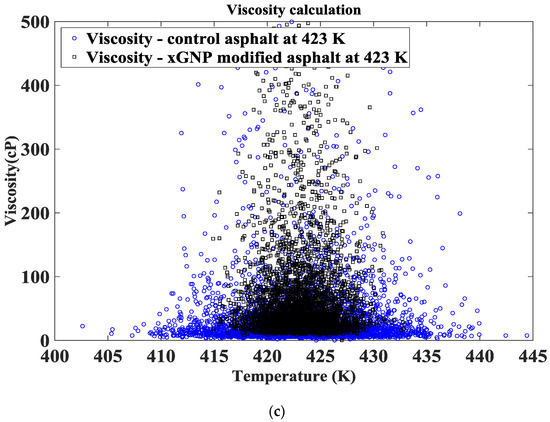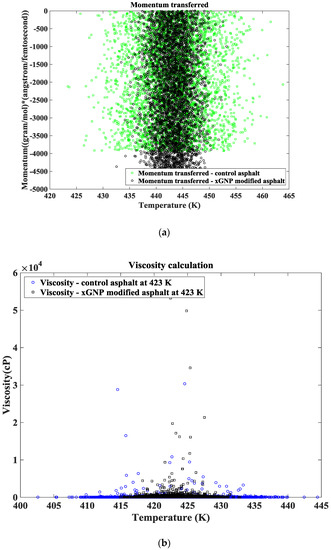 Figure 6a displays the momentum transferred in the control and xGNP modified asphalt binder systems at a temperature of 443 K, as well as some of the results from different temperatures for repeatability. The momentum transferred in the xGNP modified asphalt binder model is more than that of the control model. The temperatures in the control asphalt binder model fluctuate more than those of the xGNP modified asphalt binder model due to there being fewer molecules. The temperatures are also around 443 K, and do not have large variations. It indicates that more molecules in the MD system lead to less data variation and a stable structure of materials. It coincides with the conclusion that the vibrating range of MD data is within a variation [40] (N is the number of molecules in the system). Figure 6b,c demonstrates the viscosities of the control and xGNP modified asphalt binder systems at a temperature of 423 K, and it is also part of data analysis under different temperatures. The temperature fluctuation of the control model is larger than that of xGNP modified asphalt binder model due to fewer molecules compared to xGNP modified asphalt binder system. The temperatures are also centered at 423 K with a 20 K variation. It coincides with the temperature setting of simulations. Furthermore, the statistical analysis of viscosities of the control and xGNP modified asphalt models was performed to analyze the distributions of viscosity data in MD simulation.