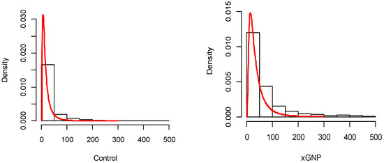 where and . In this study, we consider the lognormal distribution, because it provides heavier tails compared with the normal one and is thus more flexible to experimental data when studying robustness to outliers. Due to large variations of data from 7.375894 to 53,239.325870, we consider the more appropriate fits based on data ranging from 0 to 300, and from 0 to 500. The parameter estimates of μ and σ with their standard errors in parenthesis are presented in Table 2. The histograms with the fitted lognormal distributions are depicted in the top two figures (Figure 7). It can be seen from the two figures that with different choices of truncations, the lognormal distribution provides more flexible fits to xGNP data. A similar conclusion can also been drawn for the fitness of the lognormal distribution to control data (Figure 7). Consequently, we may conclude that the data departure from the lognormality is acceptable or slight, the lognormal distribution is a more robust and flexible model, allowing a better fit as shown above.