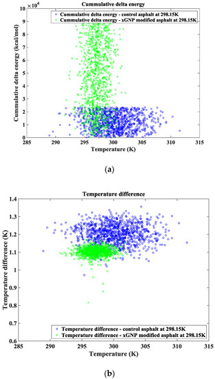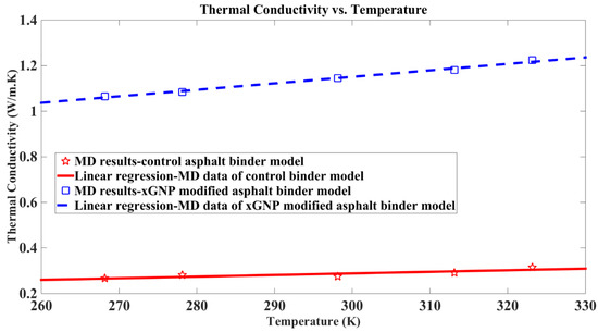 Figure 10a shows the cumulative energy input in different molecular binder systems at a temperature of 298.15 K. The control asphalt binder system has a relatively low energy input in contrast to the energy of the xGNP modified asphalt binder system due to the small number of molecules and low volume in the control binder system. The energy of the xGNP modified asphalt binder system is four times greater than that of the control asphalt binder system, and it is the same as the mass ratio of the xGNP modified asphalt binder system to the control binder system. The temperature variation of the xGNP modified asphalt binder model is also lower than that of the control binder system due to the large number of molecules. Figure 8d shows the temperature difference in different asphalt binder systems after the input of the heat flux at a temperature of 298.15 K. The variation in the temperature difference of the xGNP modified binder model is less than that of the control binder model, as well as the temperature variation in the MD simulation. It is likely that more molecules in the system result in better stress and heating responses and produce a stable system. The cumulative energy and temperature difference of the control and xGNP modified asphalt binder models at different temperatures were calculated using MD simulations, and based on Equation (9), the thermal conductivity results of the asphalt binder models are shown in Figure 11 (next section).