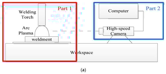 Figure 1 shows the diagrammatic drawing of a visual inspection system for the gas tungsten arc welding (GTAW); snapshot (a) is the simplified model of (b). The system contains two parts: Part 1, which is included by red rectangle, is the welding system, consisting of a welding source, tungsten welding electrode, shielding gas, weldment, and workspace. It is used for providing the experiment with a stable welding arc plasma. Conventional and pulsed current of 60 and 80 A are both used in the experiment, with argon as the shielding gas and Ti-6Al-4V titanium alloy as weldment. Part 2, which is included by blue rectangle, reveals the visual measuring system, which consists of high-speed camera and computer. Dimmer filter ND4, which is in front of the high-speed camera lens, is used for decreasing the arc brightness. The high-speed camera collects the real-time image processing signal of the welding process and transmits the signal to the computer via USB. The computer is able to control the time of exposure, sampling time, and some other parameters of the high-speed camera and save the video signal. Average pulsed current of 60 A has a peak current of 80 A and a base current of 40 A, average pulsed current of 80 A has a peak current of 110 A and a base current of 50 A, and the peak duration is all 50%. Finally, conventional and pulsed frequencies of 20 and 40 kHz, both under currents of 60 and 80 A, are used in the GTAW, and the video information is obtained.