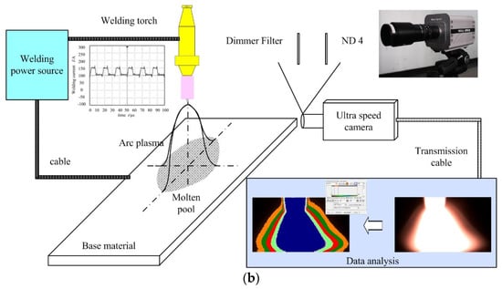 Arc welding is a traditional process technology in industry. It has been developed through a long history of studying its mechanism and engineering applications. However, many phenomena lack a systematic approach, which includes the arc constriction. With classical theory, it was found that the parallel current lines attracted each other when they were in the same direction. This is also applicable in an arc plasma [1] with direct current welding (DC welding). Most of the time, DC arc welding creates the current pointing from the base metal to the electrode. The current is formed during the movements of electrons and positive particles. The current elements with the same direction can be recognized as the current line series. They will attract each other with a macro perspective as one is surrounded in the electromagnetic field created by another. Mutual attraction occurs between any two lines or elements. It can be deduced that the Lorentz force, which is the major electromagnetic force and only changes the direction of charged particles, would constrict the arc plasma in a radial direction, which is called arc constriction. This phenomenon has been proved by experiments [2]. Arc constriction will create a pinched arc plasma [3] during the welding process. It is regularly believed to increase the stiffness, arc voltage, and energy density of the arc plasma. As a result, it will enhance the penetration and reduce the shielding area of the welding arc, which is important for the arc welding process. Firstly, constriction of the arc leads to an increased arc temperature and axial flow velocity with the increased current density [4]. Significant results can usually be obtained under the condition of a large welding current greater than 150 A [5,6] and a pulsed current [7,8]. The research [9] revealed an increased arc voltage with different shielding gases, which displayed obvious arc constriction. Secondly, some results indicate significant constriction with the pulsed welding process [10,11]. Previous work indicates that the root radius decreased during pulsed arc welding [12], and the attenuation coefficient of the magnetic force is defined to evaluate the intensity of the arc constriction, even though it was a direct reflection of the constriction view. Thirdly, some studies demonstrated the effect of arc constriction on the weld appearance [13,14], which was also proved with pulsed welding [15]. Previous work found an increase in the arc voltage and arc constriction with pulsed welding [16]. Such reflections could be correlated with the arc constriction during pulsed arc welding. Finally, the continued arc shapes were displayed to exhibit the arc constriction with an ultra-high-speed camera most of the time. Some experiments found the increased arc size with a large current [17,18], although that caused the arc constriction. Thus, the arc constriction is predicted to have other reflections with a pulsed arc plasma of more than 20 kHz. Furthermore, visual observation is very popular in arc plasma surveillance; it can be used to track characteristic elements and to conduct arc plasma diagnosis by imaging of the continuous spectra [19]. At the same time, it is simple and rapid to analyze the distribution of the temperature field using the method of image processing, and the dynamic change of the arc plasma can be monitored in real time by a high-speed camera, and the image processing methods are required in order to distinguish the region of the arc plasma for further study.