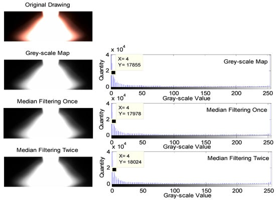 Figure 2 displays the original drawing, grey-scale map, median filtering once, and median filtering twice, respectively. The gray-scale value histogram is illustrated on the right side of Figure 2. The horizontal axis represents the gray-scale values, and the vertical axis represents the corresponding quantity of the gray-scale values of the grey-scale map, median filtering once, and median filtering twice, respectively. The results indicated the variation tendency of the de-noised image and its gray-scale value quantity was not obvious, and it can be found that there were few noise signals while collecting the visual signals with the high-speed camera. Taking gray-scale value 4 into account as an example, the grey-scale map, median filter once and twice had 17,855 points, 17,978 points, and 18,024 points. Thus, the difference demonstrated that the de-noising processing worked to remove a small number of noises, although the visual signal collected was of rather high quality. Above all, it can be concluded that the regularity is similar under the different welding currents and pulse frequencies using the same disposal method.