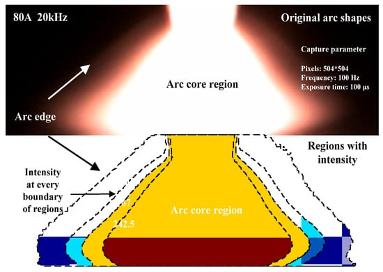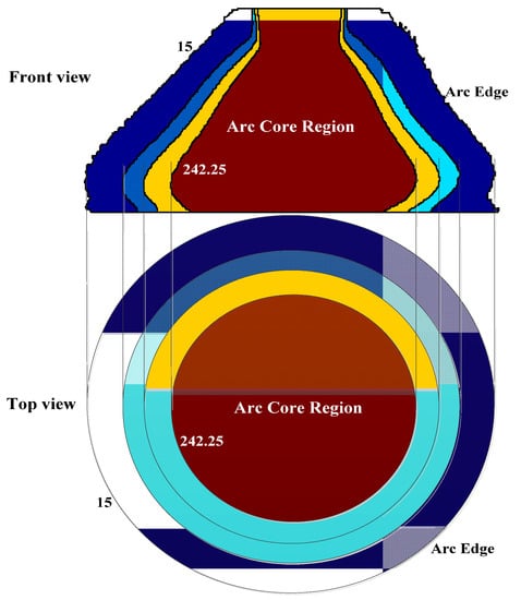Arc regionalization is an important part of the study of the welding mechanism [24]. This paper considers the selection of the region edges as the key point, and the analysis is produced with the core region and the edge of the welding arc. With the image processing mentioned before, Figure 3 illustrates a consequence of regionalization at 80 A and at 20 kHz. Compared with the original one, the critical gray-scale values of every area edge are 242.25, 167, 91, and 15 from the center to the outside. The gray-scale value 15 is proved as a boundary according to the curves of variation in intensity from the center to the outer edge. Note that the crimson part is the arc core region with the highest temperature in which the arc possessed the most concentrated plasma, the largest current density, the most drastic ionization thermal motion, and the largest energy. The other area of the arc is occupied by the other zones. Figure 4 illustrates a front view of the arc and a top-down view sliced in the maximal radius of the arc. The ratio of the core region to the total area is 59.92%. The method above is capable of examining the ratio of the core region to the total area, and it is simpler and more convenient.