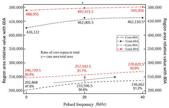 Figure 5 illustrates the core and total areas against the pulsed frequencies. It is a double-coordinate line chart, with the horizontal axis representing the pulsed frequency and 0 kHz representing the conventional direct current, while the vertical axis on the left shows the region area relative value with 60 A and, on the right, it indicates the region area relative value with 80 A. The total arc region expanded with the large current, which coincided with the classical theory. That means the arc with the large energy input possessed a larger portion of the region. A possible reason for this is that more ionization results in a greater particle collision region. The welding current can be maintained in an expanded region as the charged particles are enough to guarantee the stable current transformation. Thus, the welding current level from 60 to 80 A made a large total area of the arc plasma. The current increased by 33% and, in contrast, the total arc region increased by 14.75%. Furthermore, the core region expanded with the large total area, and the increasing rate was about 22%. The ratio of the core region to the total increased from 47.7% to 50.5%.