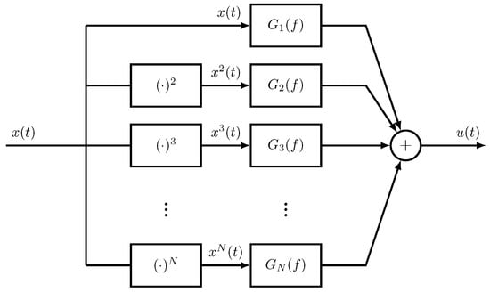 On the other hand, the Volterra series representation is usually considered to be more effective but less practical due to the highly complex calculation of multidimensional kernels [,,,]. A Generalized Hammerstein model [,,] represents a very good compromise between the complexity and the efficacy. It is made up of N parallel branches, with each branch consisting of a linear filter preceded by an N-th order power static nonlinear function, for . The output of such a model to any input is governed by the following equation