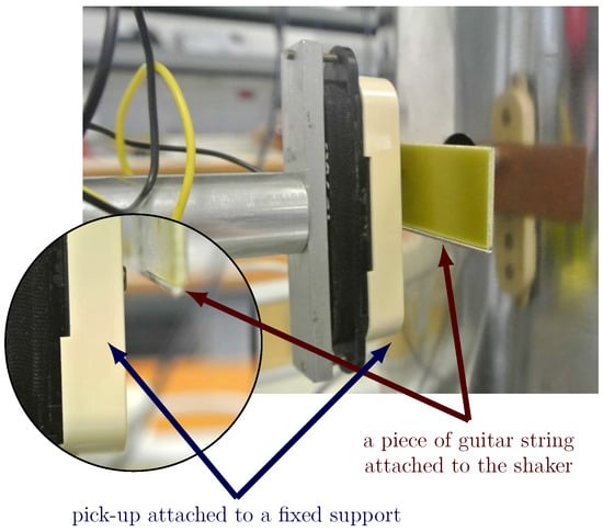 To protect the shaker from a possible destruction due to excessive displacement or current, the frequency range is furthermore limited to the span 15–500 Hz. The excitation signal is pre-filtered using a linear filter so as to obtain a displacement whose amplitude is almost constant over the frequency span. The peak amplitude is set here to 1 mm. The displacement of the string portion (that is, the displacement of the shaker) is measured by means of a single-point vibrometer (OFV-503 and OFV-505, Polytec, Irvine, CA, USA), pointing at a piece of reflective tape glued to the string support. The electrical output of the pickup is then connected to an acquisition card that exhibits a high input impedance (470 kΩ). Consequently, the measured output voltage corresponds to the open-circuit voltage that does not take into account the effect of pickup output impedance.