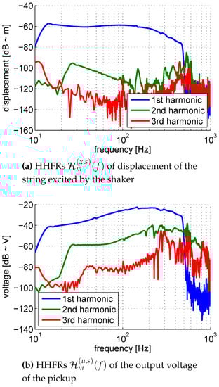 The fundamental harmonic of the string displacement (Figure 4a) is not flat despite the pre-filtering and the second harmonic reaches dB relative to fundamental harmonic. It is thus rather difficult, or almost impossible, to estimate which part of the HHFRs of the pickup output voltage (Figure 4b) is due to the pickup behavior and which part is due to the shaker behavior.