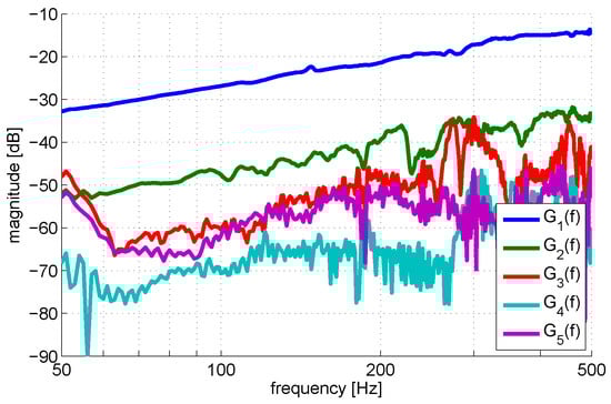 For the pickup under test, a fifth order Generalized Hammerstein model, the magnitude values of which are depicted in Figure 5, is identified using this technique. The order of the model is chosen as a compromise between the sufficient number of branches of the Generalized Hammerstein model (to be able to reproduce the nonlinear effect correctly) and the noise level.