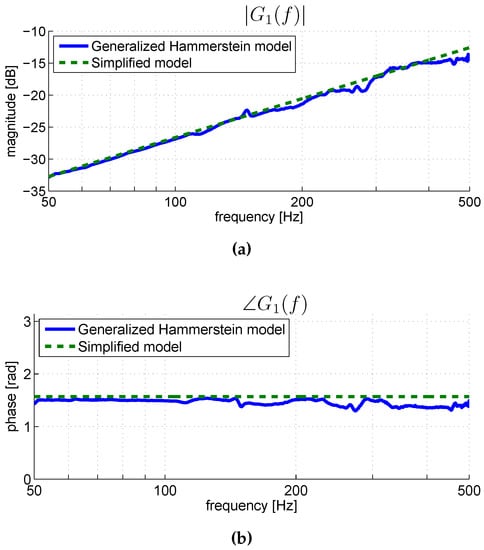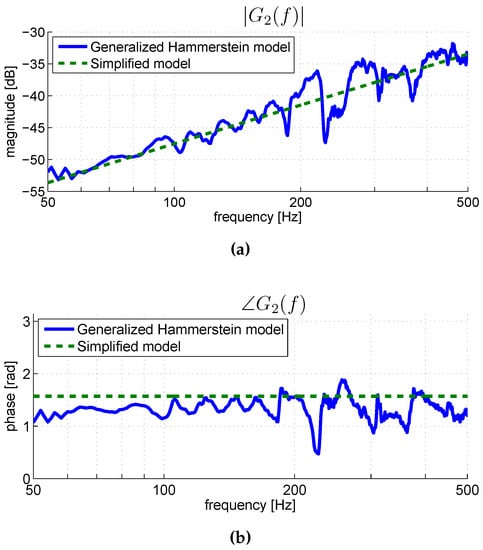 Observing the estimated filters of the Generalized Hammerstein model depicted in Figure 5, one can note that the dependence on frequency for all filters is approximately 6 dB/oct. Such a slope corresponds to in the frequency domain or to a simple derivative in the time domain.