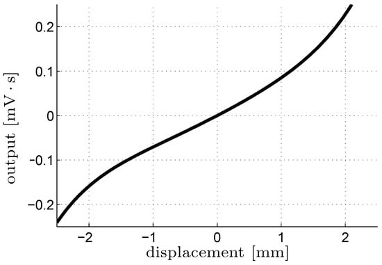 This relation being a time derivative of a Taylor series, we can simplify the Generalized Hammerstein model to a Hammerstein model consisting of a static nonlinearity followed by a linear filter (Figure 1). In this particular case, the static nonlinearity is represented by a simple Taylor series with coefficients , and the linear filter is represented by a time domain derivative, as shown in Figure 1. This result tends to confirm the model previously proposed by []. The fitted coefficients for the pickup under test are given in Table 1, and the corresponding input–output characteristic is depicted in Figure 8.