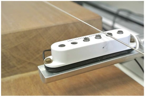 Physical modeling and synthesis of musical instruments has been an active research field for the last few decades [,] including a guitar and an electric guitar [,,,,,,]. One of the most important elements of an electric guitar is a pickup, a sensor that captures the string vibrations and translates them into an electric signal []. It is basically composed of a set of permanent magnets surrounded by an electric coil. A ferromagnetic string vibrating in the vicinity of the pickup results in a variation of the magnetic flux through the coil. According to Faraday’s law, an electrical voltage is then induced across the coil.