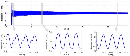 The string is struck using an impact hammer. A single-point vibrometer (OFV-503 and OFV-505, Polytec, Irvine, CA, USA) pointing at a piece of reflective tape glued to the string and located above the pickup allows the measurement of the string displacement in the vertical plane. Temporal evolution of both string displacement and pickup output voltage are recorded simultaneously and depicted in Figure 10 and Figure 11. A zoom on a few periods of both experimental signals is given for three different time lags along the time-varying response. As expected, the string displacement is distorted just after the excitation (Figure 10—zoom to t = 1.3 s). It becomes less and less distorted as the harmonics of higher orders fade with time (Figure 10—zoom to t = 22 s). The output signal of the pickup exhibits the same kind of behavior with time. One can notice that the output voltage is more distorted due to pickup nonlinearities.