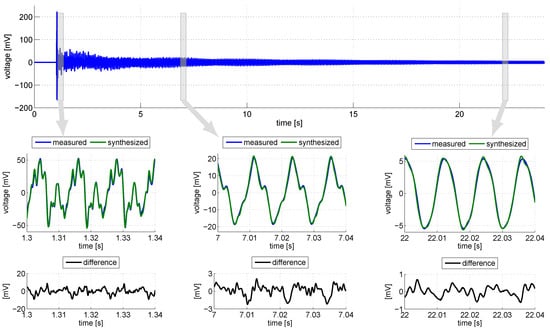 Next, in the first experimental setup used for the model identification, the movement of the rigid string attached to the shaker exhibits only z-axis polarization, whereas it is known that the string being played by a guitar player exhibits rather an ellipsoid type motion in both y- and z-directions [,]. A hammer-like impact, used in the second experiment for the synthesis, has been used to excite the string in order to approach the z-axis motion of the string in the comparative measurements whose results are provided in Figure 10 and Figure 11. Note that, even if the real movement of the string is important in both y- and z-directions [,], and it has been shown that the pickup behavior is mainly influenced by the z-axis contribution [,]. Moreover, the piece of the rigid string attached to the shaker is of finite length and does not exhibit any deformation compared to a string attached on the guitar.