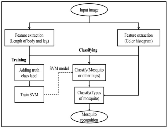 The rest of the paper is organized as follows: Section 2 presents the method used in this paper. Section 2.1 shows the system overview of the developed sensor module. Section 2.2 discusses the feature extraction method implemented. Section 2.3 introduces the SVM-based classification process used. Section 3 presents the experiments involving 400 images of mosquitoes and a predefined set of other insects to validate our approach. Lastly, Section 4 concludes this study and discusses the future work.