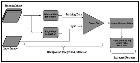 There are numerous feature extraction methods that exist in the image processing and computer vision domains. One popular approach to this end is the SIFT feature extraction method that has been extensively used for texture recognition and object identification tasks [27]. In the above-mentioned work, the authors used a standard dataset containing images of patterns and objects. In the context of mosquito classification, the above-mentioned methodology is challenging because it is quite tedious to distinguish mosquitoes considering body pattern as a classification criterion. In this work, we propose a new feature extraction method which accounts for both the color and morphological features of the acquired images of insects. In this feature extraction method, morphological difference between the mosquitoes and insects accounts for the identification of mosquitoes among the other insects. As the first step of feature extraction, the color histogram of each image is extracted. After the color histogram extraction, we segment all images for trunk and leg regions. Upon these, the ratios of the trunk width to the leg length of segmented regions are determined using mathematical formulations and distance calculation algorithms. As the third step in the feature extraction, we perform the truth class labeling for the extracted feature and use it for training the support vector machine classifiers. Figure 2 shows the flow diagram of the feature extraction method used in this research work. For the background–foreground extraction, we used the graph cut algorithm commonly used in the computer vision community. The graph cut is a graph theory-based image processing method which is used for segmentation of images [29]. In order to use the graph cut algorithm for extracting the background or foreground, the algorithm must be trained with foreground or background regions of the image. Therefore, we determined the edges and saliency map of the images.