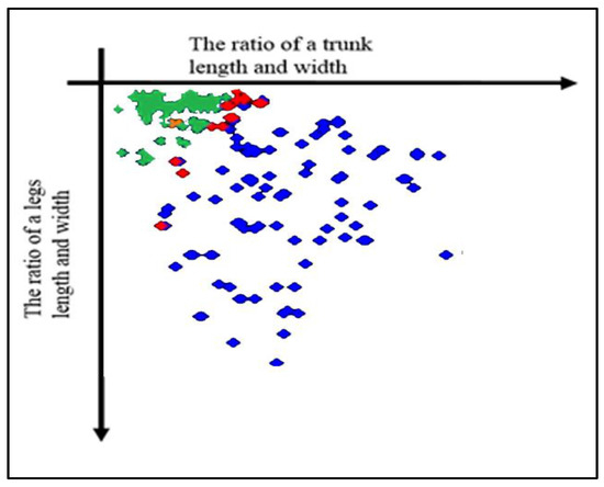 After the process of image segmentation, the ratios of the trunk width to the leg length of segmented regions have to be estimated. For the trunk-width and leg-length estimation, we adopt different methodologies. In the case of the leg-length estimation, we transform the leg region image to a sparse image consisting of end point, branch point and passing point. The shortest distance between the endpoints gives the length of the leg region. We use Dijkstra’s algorithm [32] to obtain the shortest distance between the end points. For finding out the width of the trunk region, we determine the centroid of the trunk region first. The minimal distances measured from one boundary pixel to the other in the trunk region are calculated along all the directions indicated by a straight line passing through the centroid. This minimal distance gives the trunk width. Figure 6 explains the length and width estimation of leg and trunk regions. The normalized form of the length-to-width ratio of the leg and trunk regions becomes the morphological feature extracted from the mosquito images. Equation (1) represents the normalization of ratios as captured in this work.