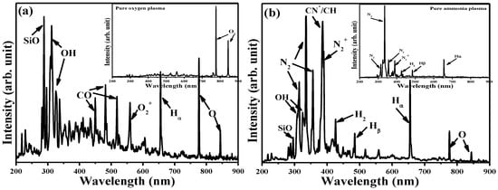 Optical emission spectra (OES) recorded from the glow discharge of the TMS-O2-NH3 gas mixture at an ammonia gas flow ratio of (a) 0 and (b) 0.5, respectively.